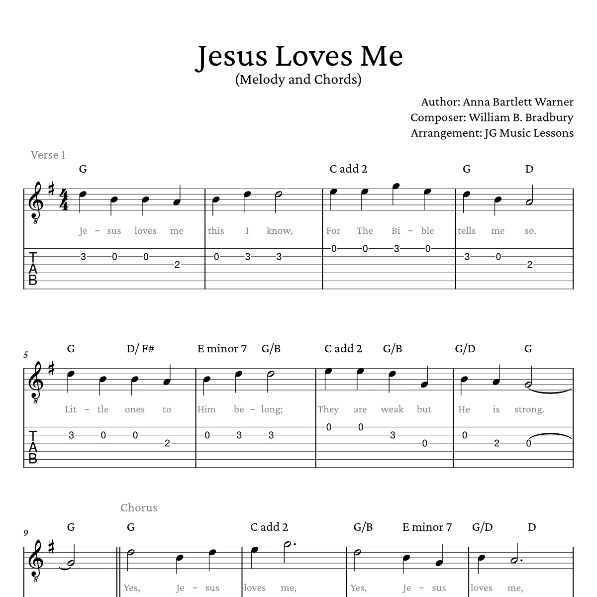 Sheet music for Jesus Loves Me with guitar tabs including: